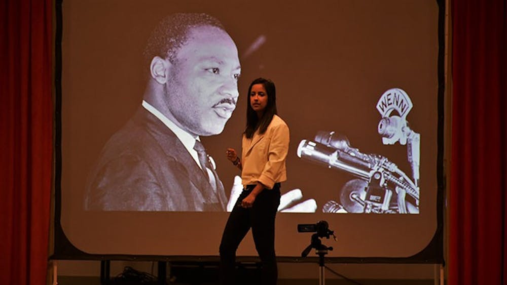 Before Hannam began her speech, the lights dimmed and Cornelio Joseph, a drummer, began tapping a drum and dancing as photos from the civil rights movement flashed behind him.