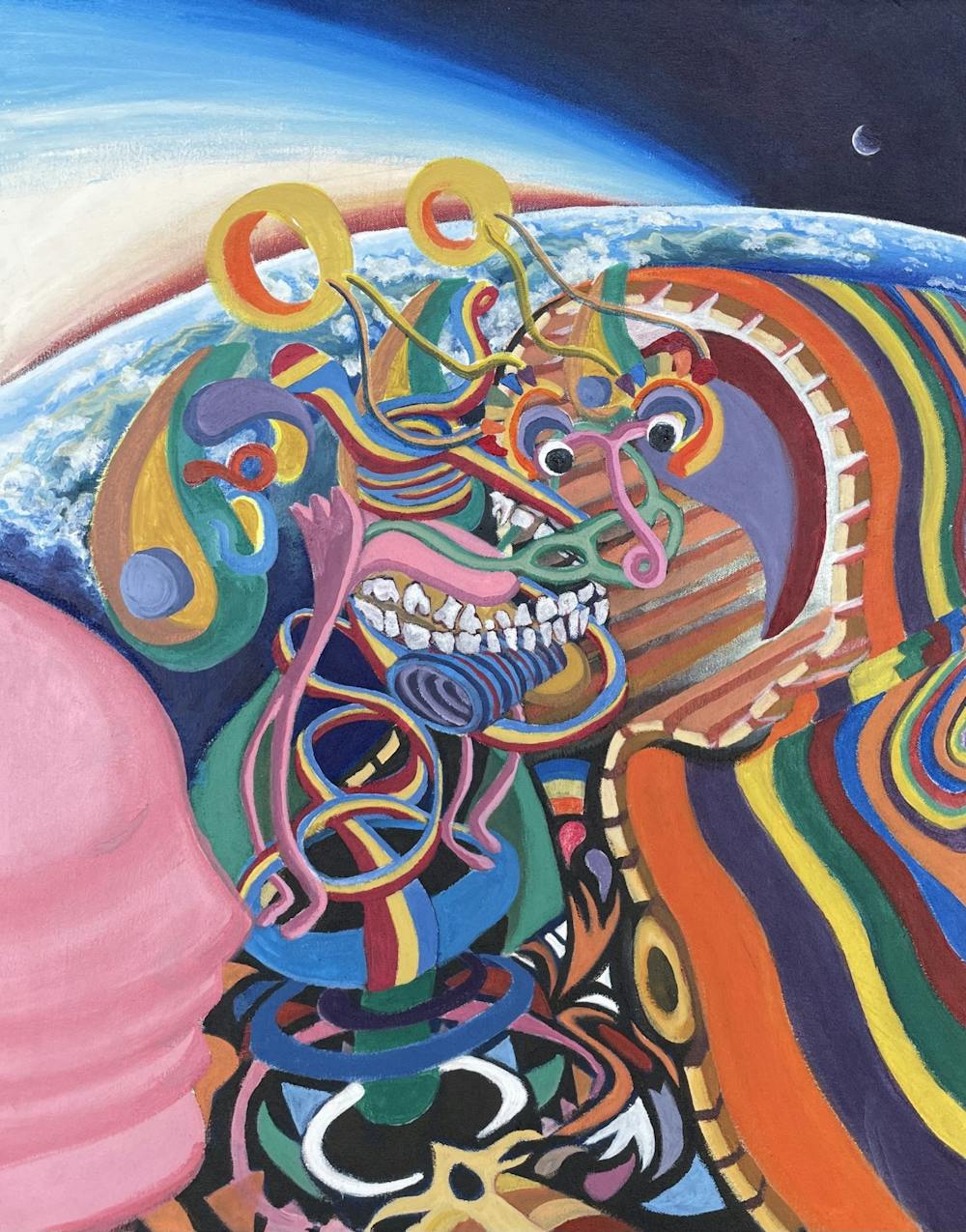 “I just kind of did this panoramic perspective and I used a limited palette, so there were a lot of challenges for me, and it turned out well. I’m really proud of it,” Conroy said. Nature, organic imagery and geometry are some of Conroy’s influences when painting, but he is also drawn to playing with ideas of expanding perception through visuals and asking more existential questions in his work.