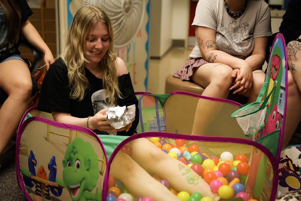 WSYC Station General Manager Caitlyn Shetter enjoys dinner in a ball pit.