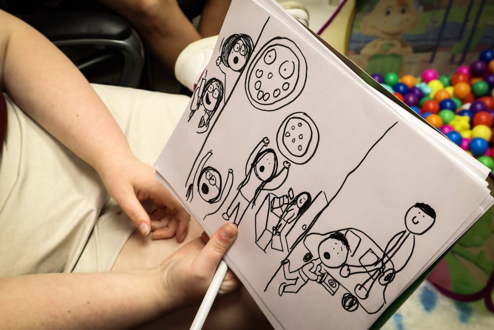 Lohrey is a frequent subject of student art at WSYC. Pictures of him as the Joker or the moon adorn the walls of the radio station. This night’s addition? Lohrey as a pizza overlooking the WSYC staff imagined as pizzeria employees.